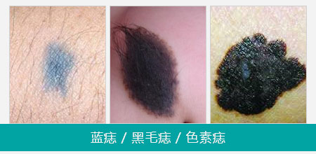 婴儿胎记、太田痣、咖啡斑、黑毛痣、伊藤斑、贝克痣、鲜红斑痣、草莓样血管瘤、海绵状血管瘤等胎记。
