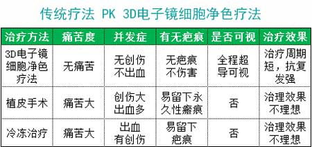 传统治疗手段只能去除表皮层色素,而无法清除深藏在真皮深层的顽固色素沉着、变异、病变色素细胞。但真正疗效好且不复发的却很难找到。原因在于方法单一,治疗不分级分类分型分龄分期,无法对症治疗,难以实现真正意义上“分型论治、多维治疗、科学祛色”。