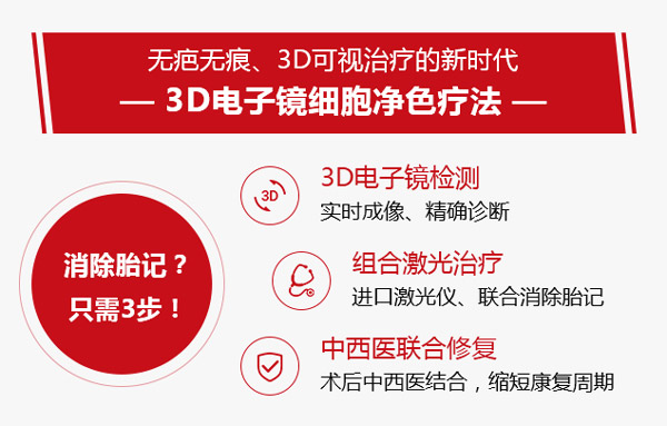 迪邦胎记研究所在激光治疗的基础上,融合了3D电子镜和中西医修复疗法,开创了新一代的治疗方式。治疗中对深层病灶立体成像,在可视技术引导监测下,专家对胎记患者皮肤组织内层结构一目了然,清晰直观的看到表皮、真皮层的异常增生,可准确对病变进行定位治疗,不损伤正常组织。"3D电子镜"治疗模式真正实现了治疗透明化、定位精准化,解决了传统治疗"看外不看内"的表面治疗难题,实现了无疤无痕治疗,缩短修复周期的同时,还降低了后期胎记复发率。