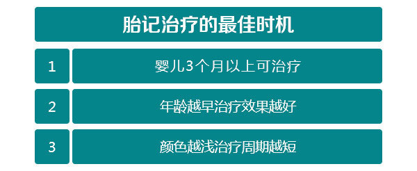 把握好的治疗时机,往往使胎记的治疗变的简单,这是由胎记的进行性生长机制决定的。在幼儿时期,胎记处于早期阶段,面积普遍比较小,颜色也相对较浅,造成的皮损也相对较浅,再加上此时儿童正处于快速生长发育阶段,新陈代谢旺盛,吸收能力强,组织修复快,所需治疗次数相对减少,治疗费用也会有所降低,目前的技术条件下,婴儿出生3个月以上即可进行治疗,非常安全,对婴儿的发育无任何影响,一些症状较轻的患儿经过一次治疗就能痊愈。因此,胎记早诊断、早治疗非常重要。