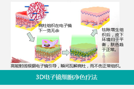1、3D析断层检查:采用电子镜对血管瘤组织进行3D成像化,观测色素分布范围,锁定病变组织细胞。