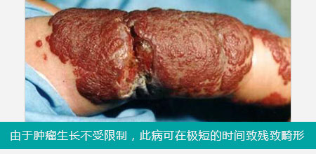 2、致畸致残:海绵样血管瘤会压迫神经、肌腱、其他组织器官等,引起占位性病变,引起疼痛、畸形等并发症。若生长于四肢,此病可引起患肢肿胀、畸形、肌肉萎缩,导致患肢发育不良,或残疾。
