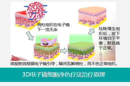 迪邦胎记研究所在激光治疗的基础上,融合了3D电子镜和中西医修复疗法,开创了新一代的治疗方式。治疗中对深层病灶立体成像,在可视技术引导监测下,专家对胎记患者皮肤组织内层血管结构一目了然,清晰直观的看到表皮、真皮层的异常增生,可准确对病变血管进行定位治疗,不损伤正常组织。"3D电子镜"治疗模式真正实现了治疗透明化、定位精准化,解决了传统治疗"看外不看内"的表面治疗难题,实现了无疤无痕治疗,缩短修复周期的同时,还降低了后期胎记复发率。